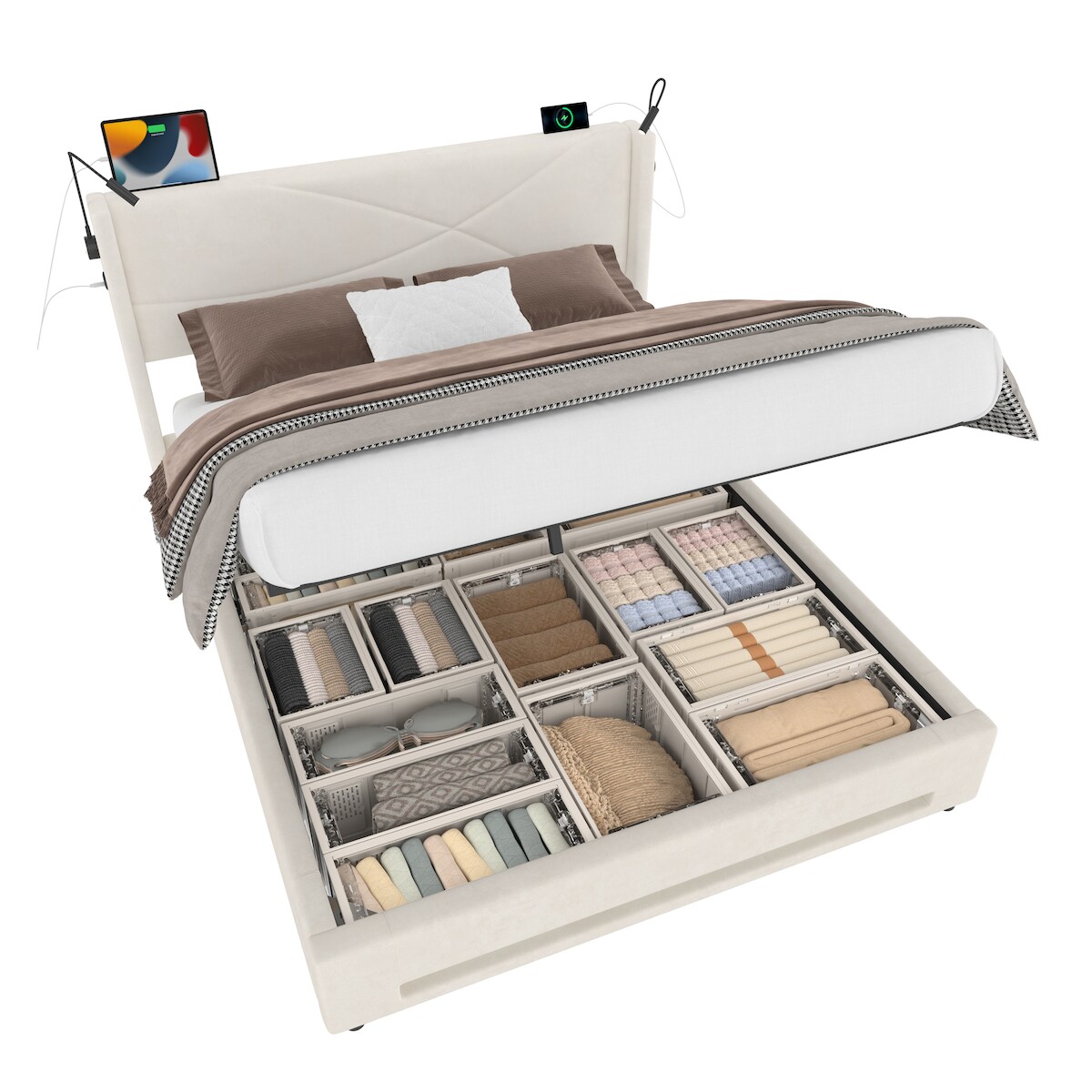 OKWISH Bettgestell 140x200 cm Velvet Kopfteil LED-Beleuchtung Hydraulisches Stauraumsystem USB-Anschlüsse Modern Beige