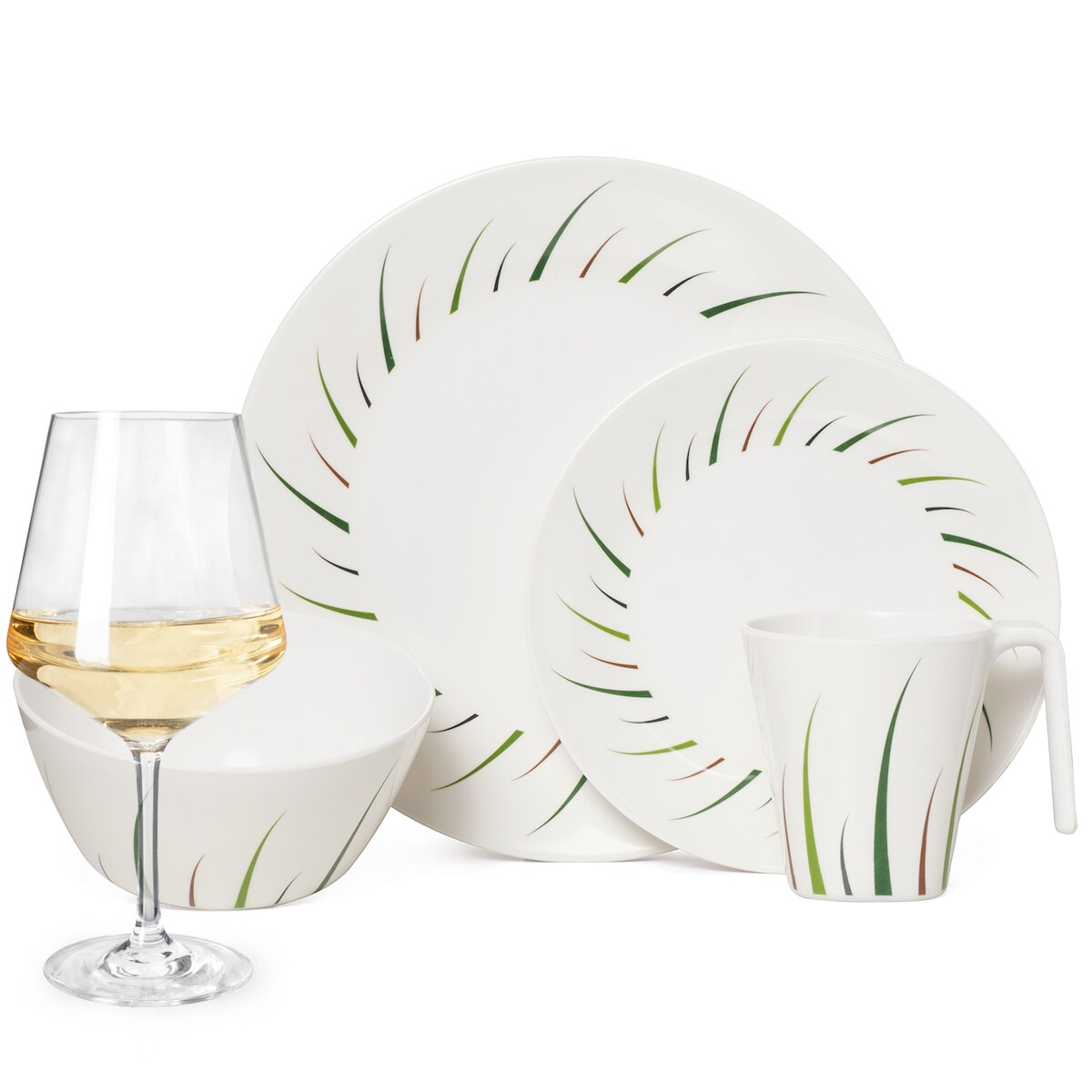 Moritz Melamin Geschirr-Set 4 Personen Limon Design 16 Teilig + 4 Milano Weiß Weingläser Tafelgeschirr Picknick BBQ Kochgeschirr