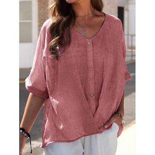 Per donna Camicia Camicie ispirate al lino Abbottonare Blusa Tinta unica Essenziale Casual Manica 3/4 Scollo a V Top Regolari Quotidiano Bottoni Rosa Blu Cachi Autunno Inverno