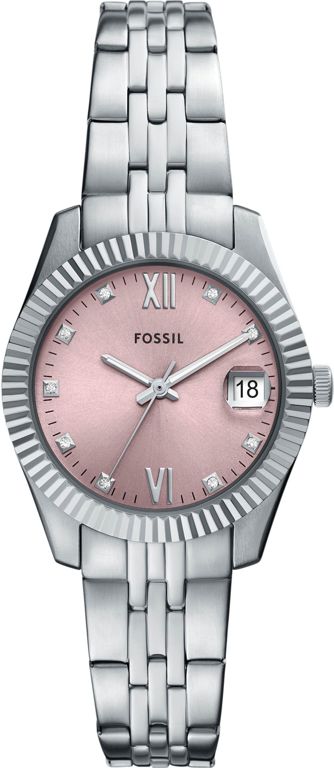 Quarzuhr FOSSIL "SCARLETTE MINI", silberfarben, rosa, Armbanduhren, Damen, Armbanduhr, Damenuhr, Datum, analog, Edelstahlarmband