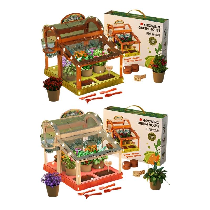 Kids Planting Set With LED Lighting Clear Acrylic Small Greenhouse For Home Gardening green