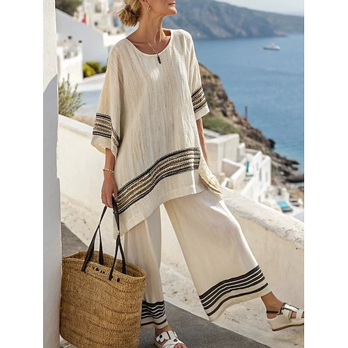 Completi di pantaloni in lino sintetico da donna top bolero maniche 3/4 collo tondo moda a righe streetwear casual quotidiano all'aperto blu nero bianco estate vestibilità morbida