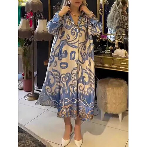 abito maglione donna stampa a righe arricciato girocollo midi elegante bohémien casa quotidiano estate