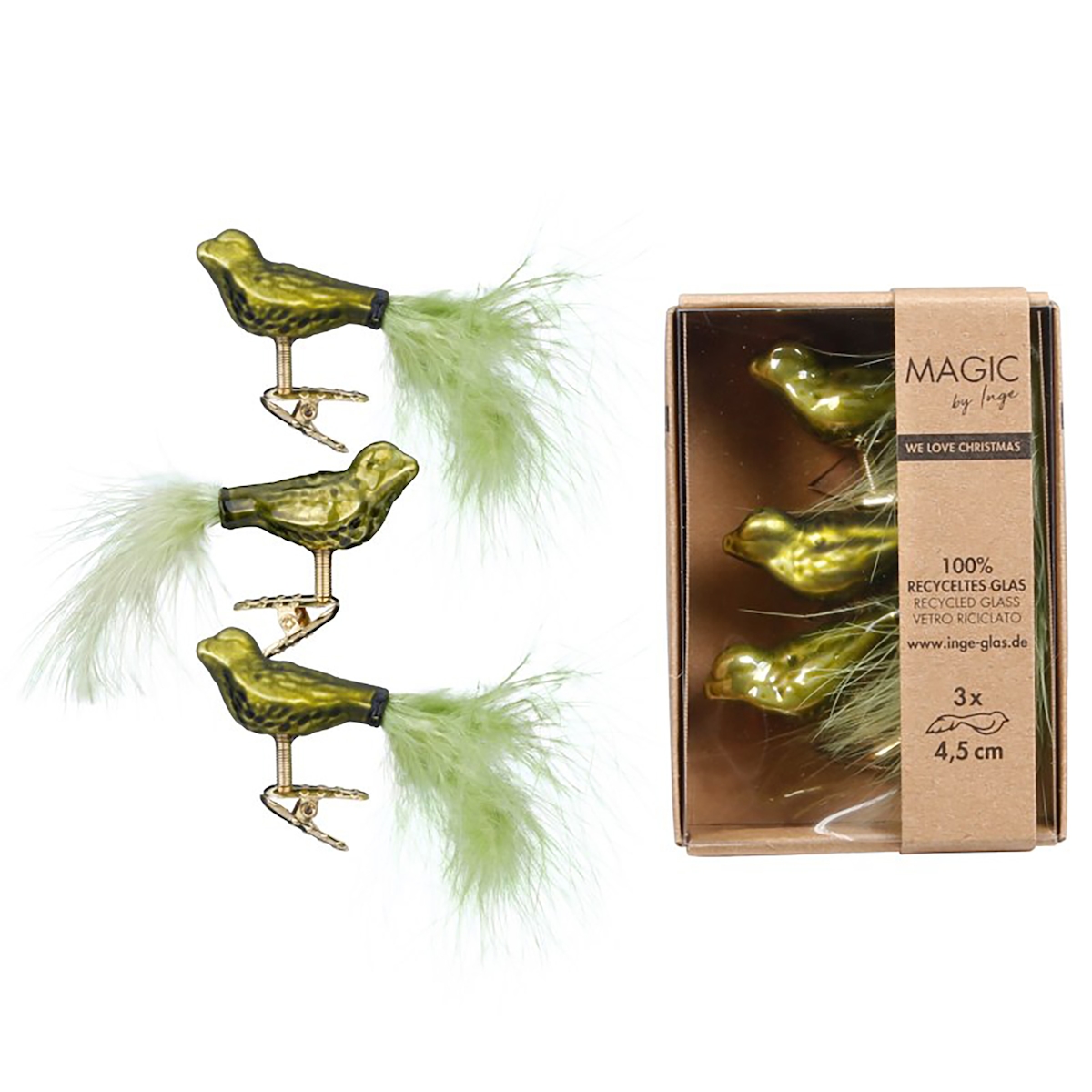 Inges Magic & Goodz 3 Christbaumschmuck Vögel auf Clip 4,5cm Glas Christbaumkugeln Kleine Weihnachtskugeln Weihnachtsbaum Deko Weihnachtsbaumschmuck Uni Olivgrün