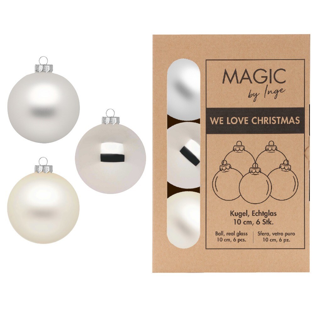 Inges Magic & Goodz 6 Weihnachtskugeln 10cm Glas Christbaumkugeln Weihnachtsbaumkugeln creme silber