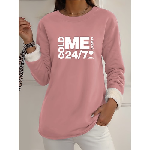 Felpa con fodera in pile da donna, pigiama, sì, ho freddo, lettera, streetwear, casual, manica lunga, girocollo, regular, per le feste, per uscire, stampa, nero, rosso, arancione, verde, grigio scuro