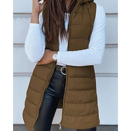 Per donna Giacca Piumino Gilet Confortevole Cerniera Tasca Casual Semplice Vacanza Streetwear Abbigliamento quotidiano Uscire Lungo Con Cappuccio Vestibilità regolare Senza Maniche Capispalla Nero