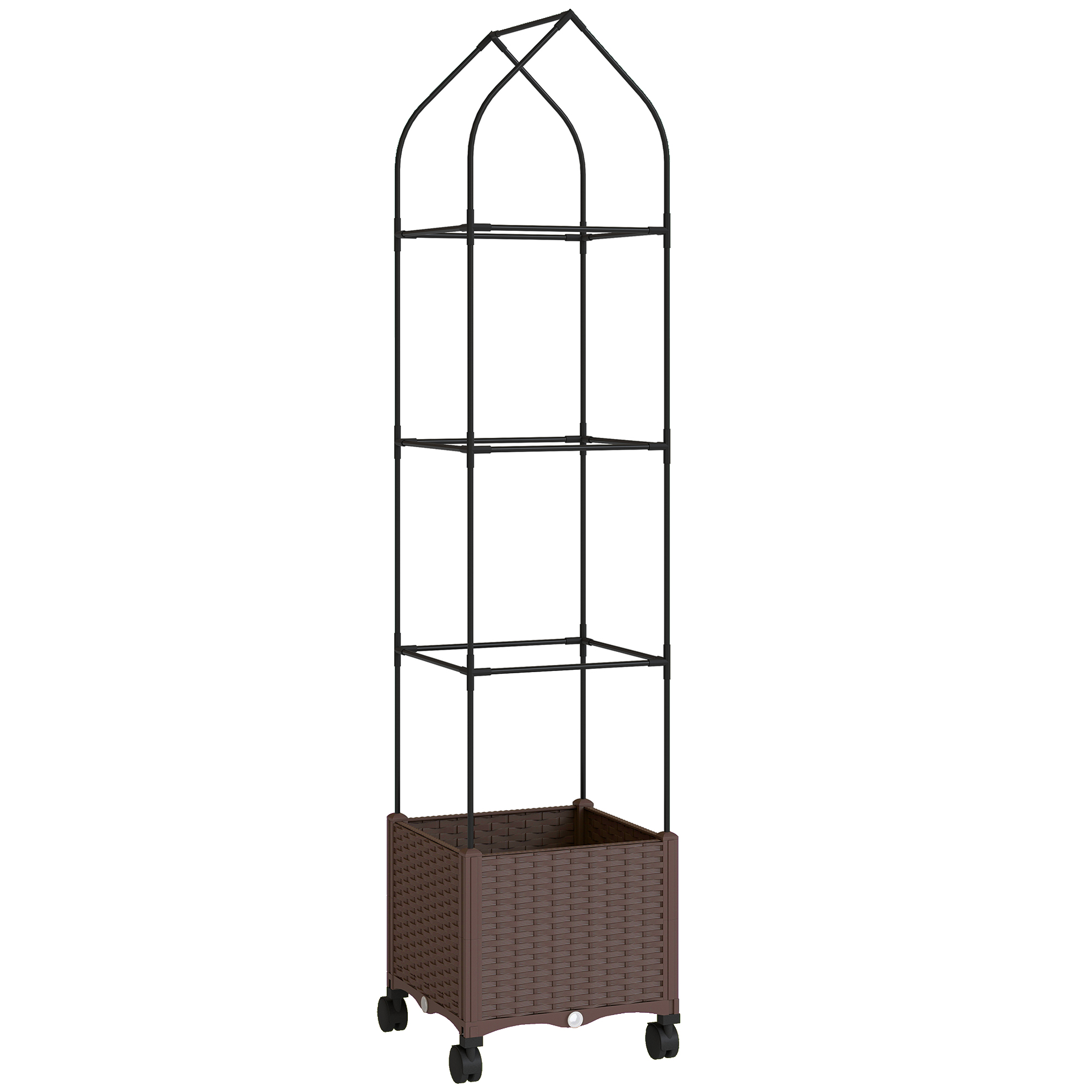 Outsunny Raised Garden Bed with Trellis, Tomato Cage with Lockable Wheels, Self Watering Planter Box with Drainage Holes, Brown