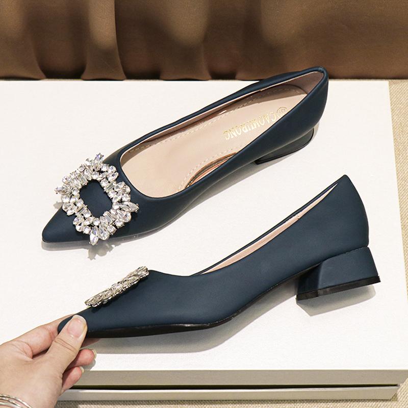 Fashion Classic Rhinestone Buckle Shoes Ladies Low Heel Office Work Tacones Mujer Wedges High Heels Pumps Women Bombas Designer Escarpin cm