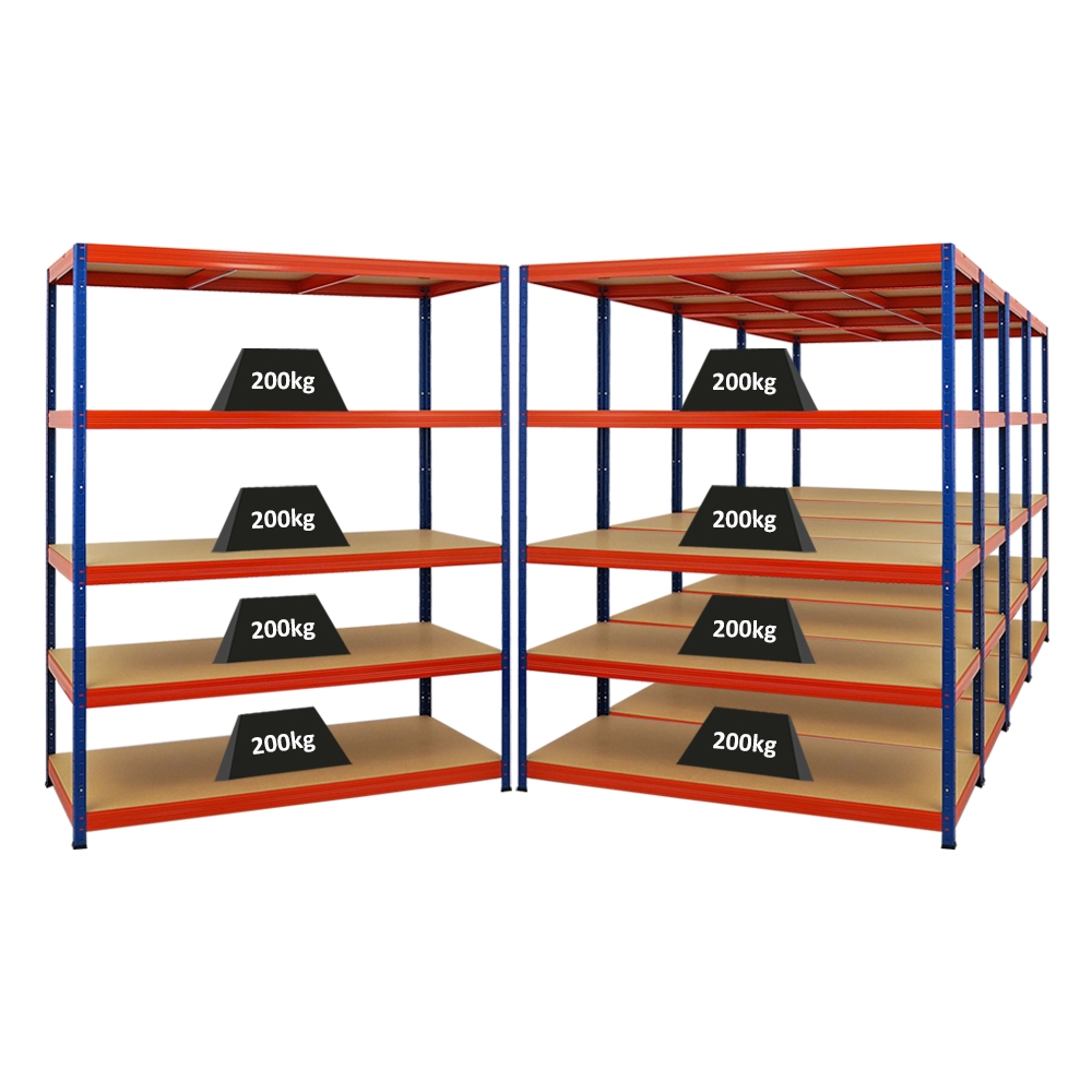 PROREGAL Mega Deal 5x Profi Schwerlastregal Rhino | HxBxT 180x200x60cm | 4 Spanplatten-Ebenen 16mm | Fachlast 500kg | Blau-Orange