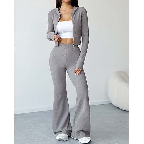 Per donna Tuta da yoga Set da allenamento da 2 pezzi Con zip Gamba larga Tinta unica Completo Abbigliamento Autunno Grigio scuro Grigio chiaro Atletico Sportivo Pilates Vita Alta Controllo addominale