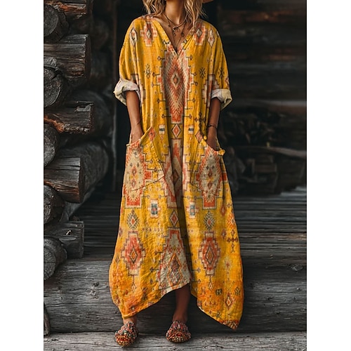 Per donna Abito lungo maxi Abito a trapezio Vacanza Casual Vestibilità comoda Floreale Grafico Manica Lunga Scollo a V Giallo Rosso Verde Primavera Autunno