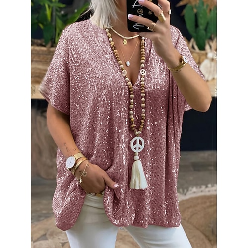 Per donna Blusa Tinta unica Tropicale Casual Manica Corta Scollo a V Top Regolari Quotidiano Paillettes Argento Nero Rosa Blu Albicocca Estate Primavera