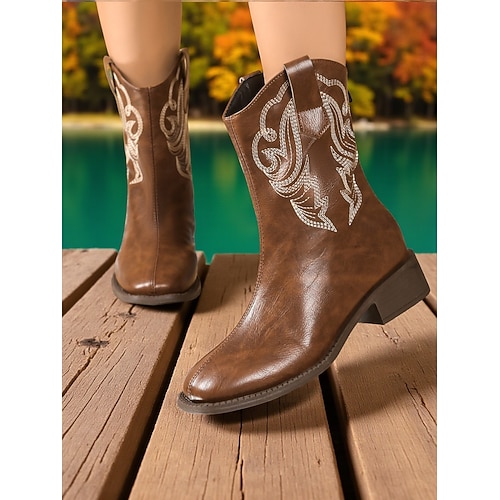 stivali da cowboy alla caviglia marroni da donna con motivo western ricamato e tacchi a blocco, calzature in stile western bohémien