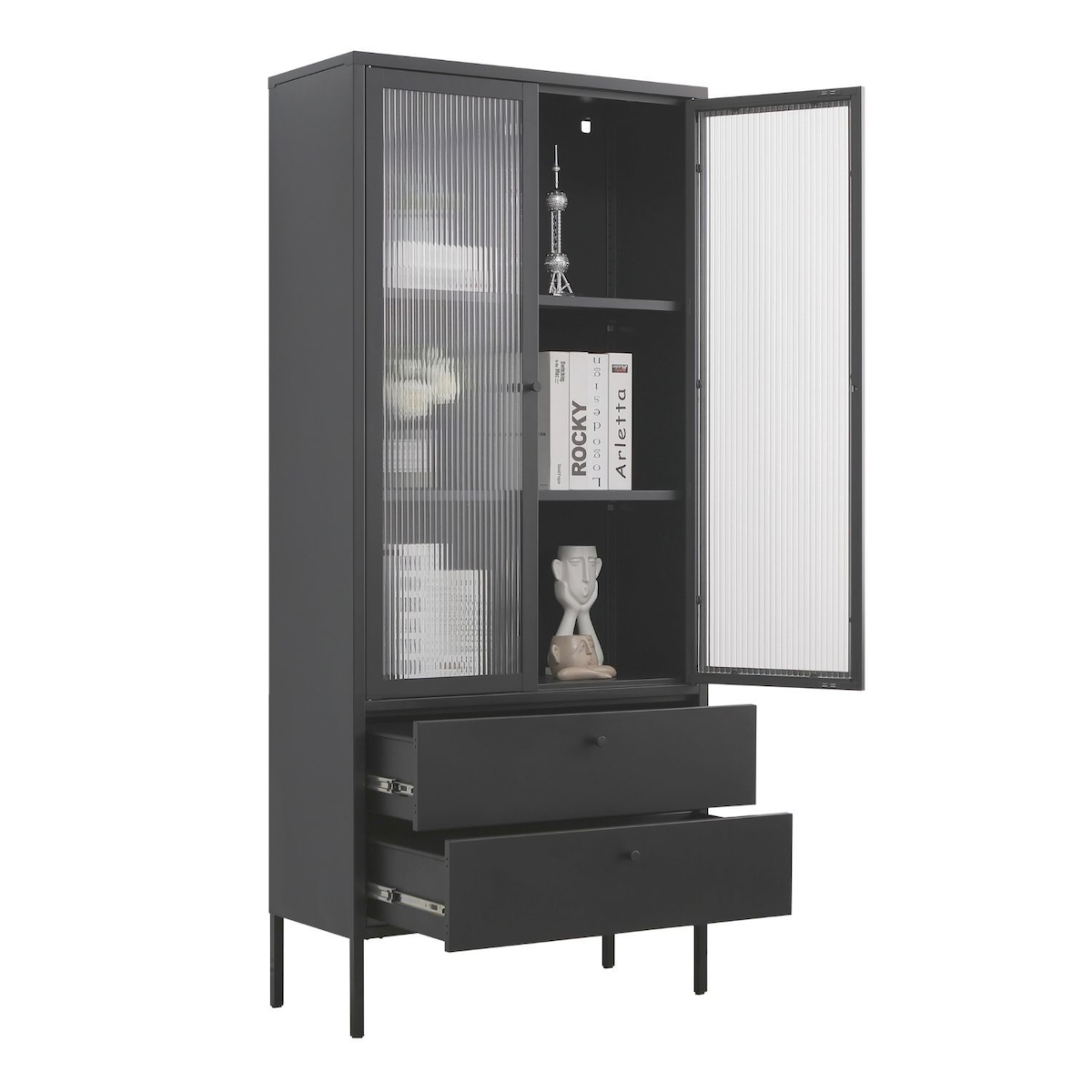 Mein-Regal Vitrine Paris Schwarz aus Metall mit Schubladen und Glastüren