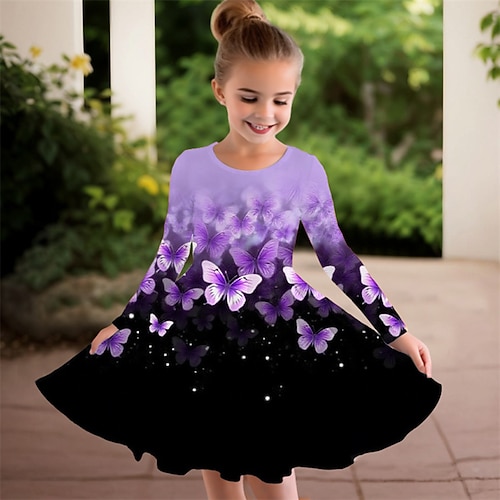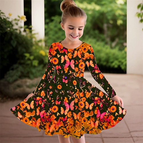 ragazze' 3D Floreale Farfalla Abito Manica Lunga Estate Primavera Vacanza Quotidiano Ferie Principessa Bello Dolce Bambini 4-12 Anni Vestito Casual Abito a trapezio Lunghezza al ginocchio Vestibilit