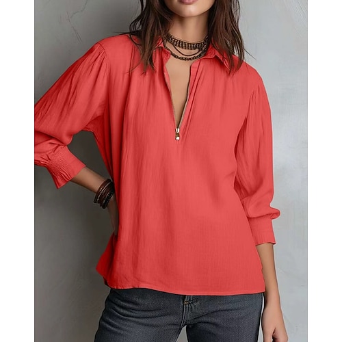 Per donna Camicia Camicie di cotone e lino Blusa Semplice Vintage Elegante Moderno Manica Lunga Scollo a V Top Regolari Quotidiano Ferie Uscire Zip a un quarto Blu Nero Rosso Verde Albicocca Estate
