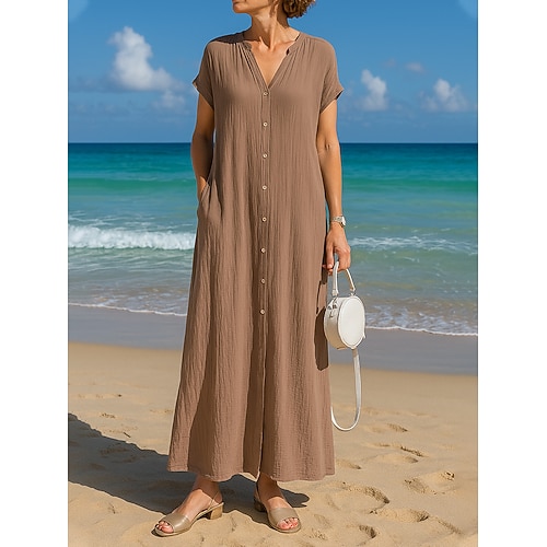 Abito Maxi Donna Vestito Estivo A Line Vestito Estivo Vacanza Casual Spiaggia Quotidiano Vacanza Uscita Fit Nascosto Grafico Geometrico Simil Lino Manica Corta Collo Tondo Collo Barchetta Marrone