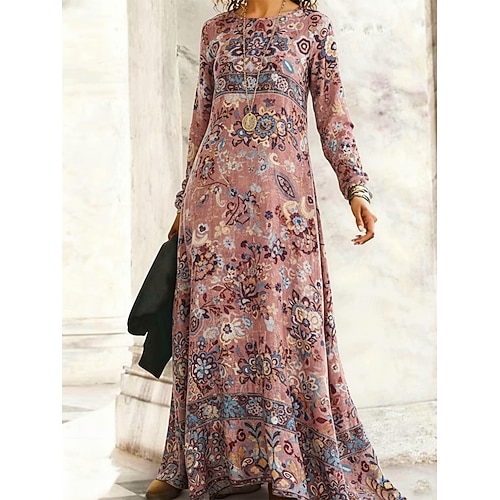 Per donna Abito Lungo Maxi Abito Vestito Casual Vestito a ruota Abito Boho Vintage Quotidiano All'aperto Weekend Vestibilità regolare Floreale Manica Lunga Girocollo Rosa Primavera Autunno Inverno