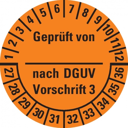 Dreifke® Prüfplakette Geprüft n. DGUV Vorschrift 3,27-36,orange,Dokufolie,Spez.,Ø25mm,21/BOG