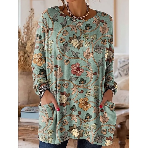 T-Shirt donna V collo manica lunga tunica floreale grafica piante vintage elegante classico top regolari stampa quotidiana blu viola arancione primavera autunno