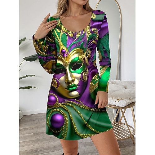 Vestito mini da donna Carnival abito a maglietta abito a T abito a linea casual adatto alla vita quotidiana grafica a maniche lunghe collo tondo nero viola verde primavera inverno