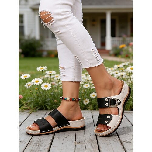 sandali da donna con doppio cinturino, fibbia e decorazioni in strass, scarpe comode per feste in giardino, uscite informali, eventi estivi e gite di un giorno