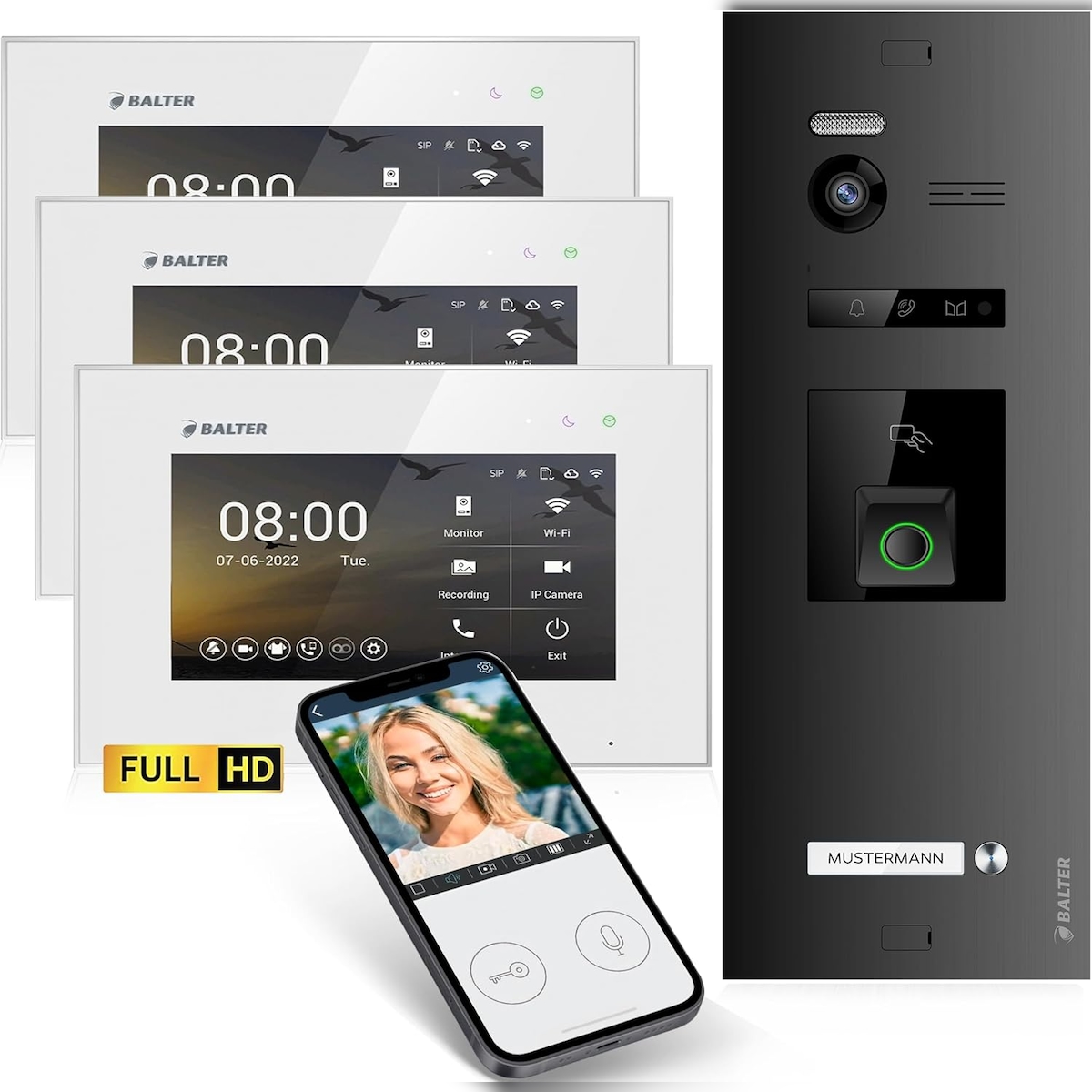 HD Video Türsprechanlage mit Fingerprint RFID und Smartphone App für 1 Familienhaus, 3x Monitore, Balter EVO HD Fingerprint