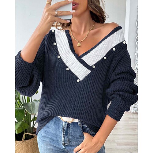 Per donna Felpa Maglione Streetwear Casual Blocco di colori Scollo a V Patchwork Lavorato a maglia Manica Lunga Top Regolari Maglia Quotidiano Ferie Uscire Nero Blu scuro Autunno Inverno