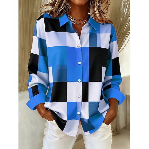 Per donna Camicia Grafico Plaid Blocco di colori Vintage Quotidiano Elegante Manica Lunga Colletto a Camicia Top Regolari Quotidiano Patchwork Bottoni Stampato Blu Viola Arancione Verde Autunno