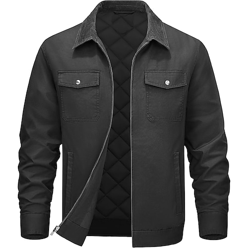 giacca da uomo in cotone per esterni, giacca da camicia, giacca cargo, imbottita, formale, da casa, tasca semplice, autunno, tinta unita, attiva, neutra, colletto della camicia, corta, nera, blu navy,