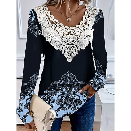 Per donna Maglietta Grafico Piante Moda Elegante Casual Manica Lunga Girocollo Scollo a V Top Regolari Quotidiano Pizzo Traforato Bianco Rosa Blu Viola Verde Primavera Autunno