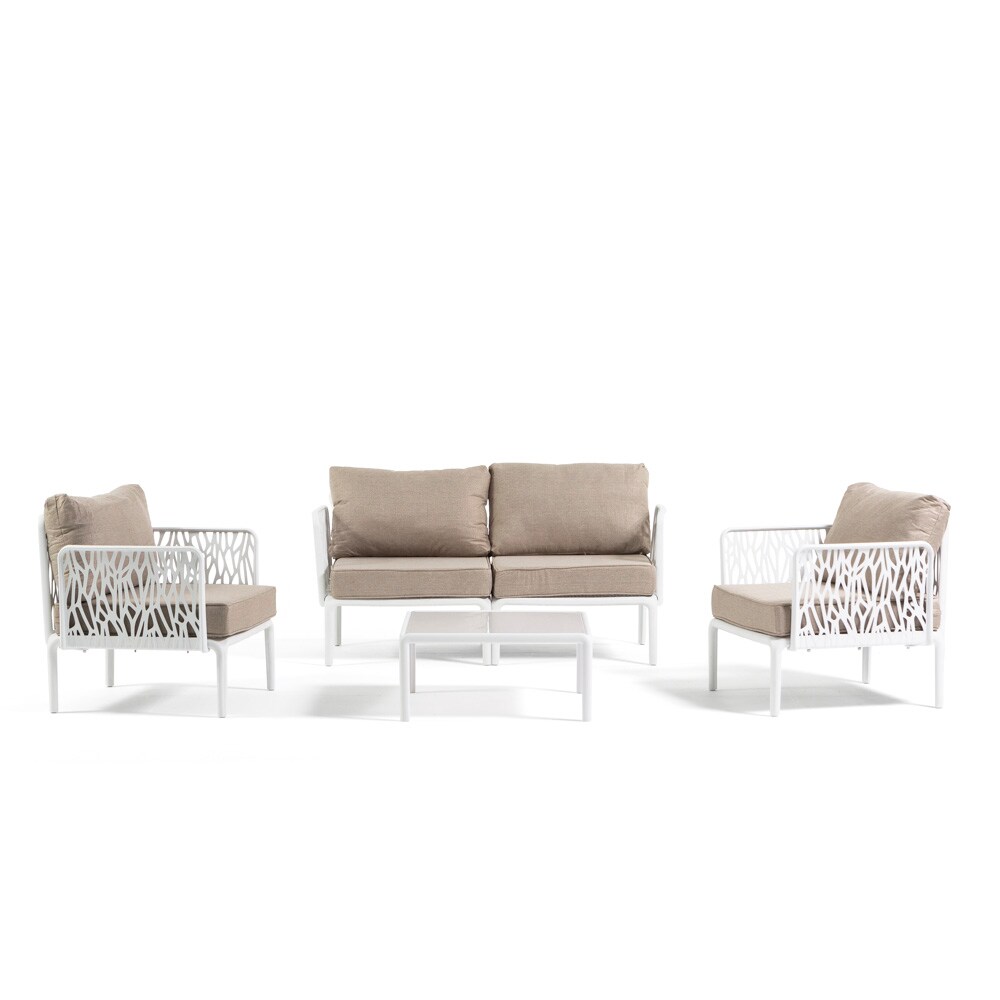 RATTATAN Gartenlounge HOYA aus Harz mit Glasfaserverstärkung und abnehmbaren Kissen, bestehend aus Sofa, zwei Sesseln und Glastisch – Weiß/Beige