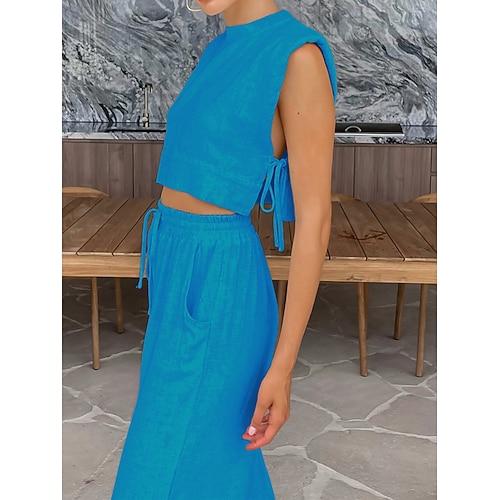 Completo due pezzi da donna, comodo, alla moda, in tinta unita, con elastico in vita, in cotone e lino, canotta, pantaloni, stile street, quotidiano, senza maniche, girocollo, rosa chiaro, rosa, blu, arancione, marrone, estivo.