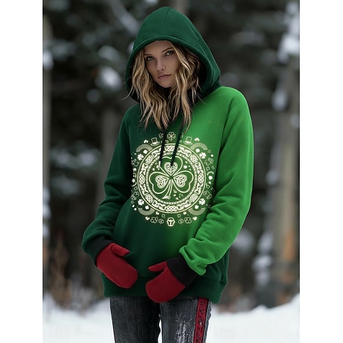 Felpe con cappuccio da donna per il giorno di San Patrizio, stile trifoglio, casual, a maniche lunghe, con cappuccio, casual, da indossare tutti i giorni, con coulisse, stampa, verde, primavera,