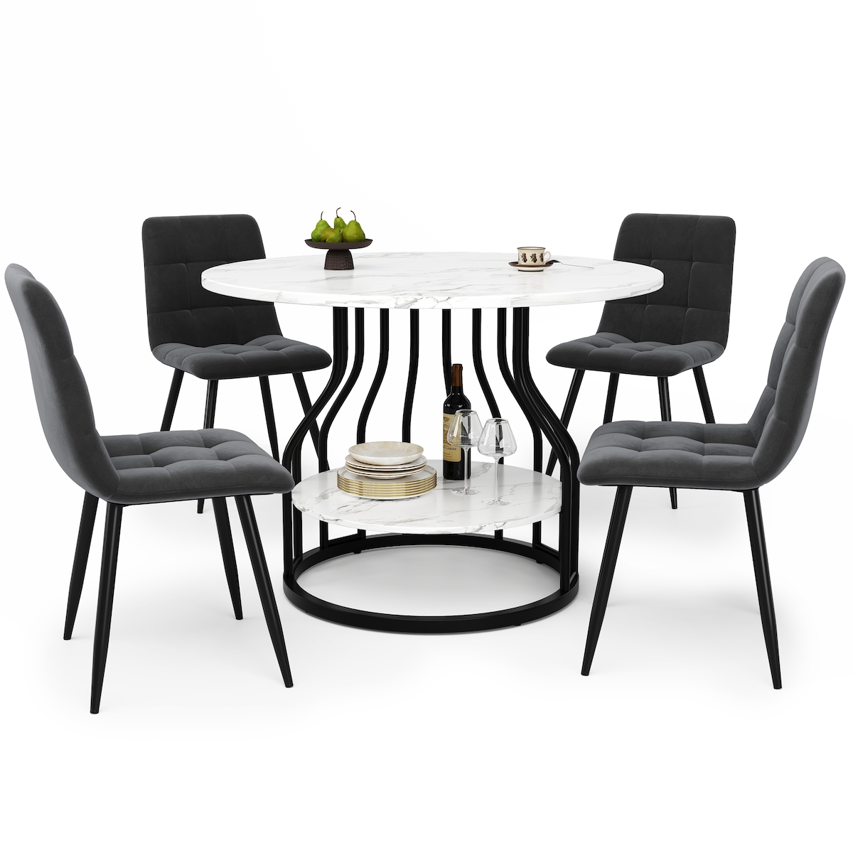 STILVORA Essgruppe 5 teilig Esstisch Set Rundtisch und 4 Stühle Schwarz+Grau 80x80x76 cm MDF Marmoroptik mit Samtbezug Metallgestell