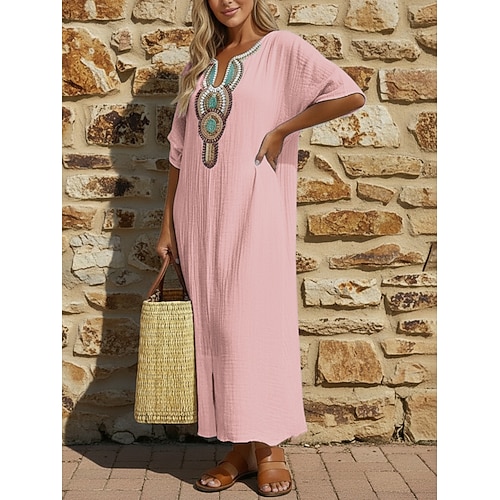 Per donna Abito Lungo Maxi Abito Misto lino Vestito Casual Vestito a ruota Abito Estivo Streetwear Abito Maxi Vacanza Streetwear Ferie Vestibilità comoda Manica Corta Scollo a V Giallo Rosa Blu scuro