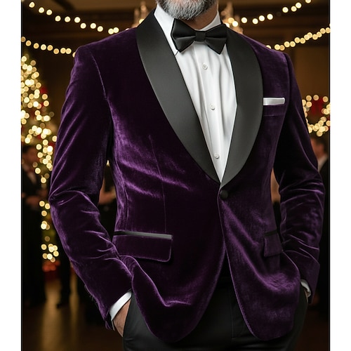 giacca blazer in velluto da uomo con collo a scialle, per feste di Natale, classica giacca tinta unita, rosso, viola, verde, vestibilità slim, monopetto, un bottone