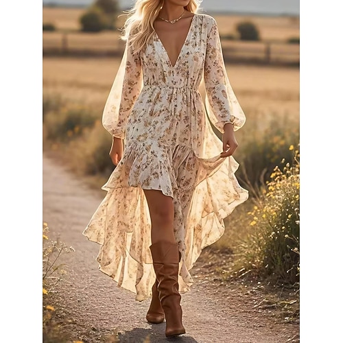 Per donna Abito maxi Abito a trapezio Casual All'aperto Uscire Vestibilità comoda Floreale Manica Lunga Scollo a V Blu Beige Estate Primavera Autunno