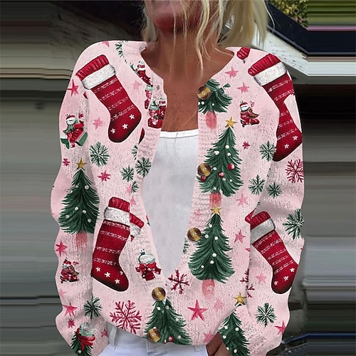 Per donna Felpa Cardigan Elegante Moda Carino Floreale Grafico Albero di Natale Girocollo Bottoni Lavorato a maglia Stampato Manica Lunga Top Regolari Maglia Natale All'aperto Casa Bianco Verde chiaro