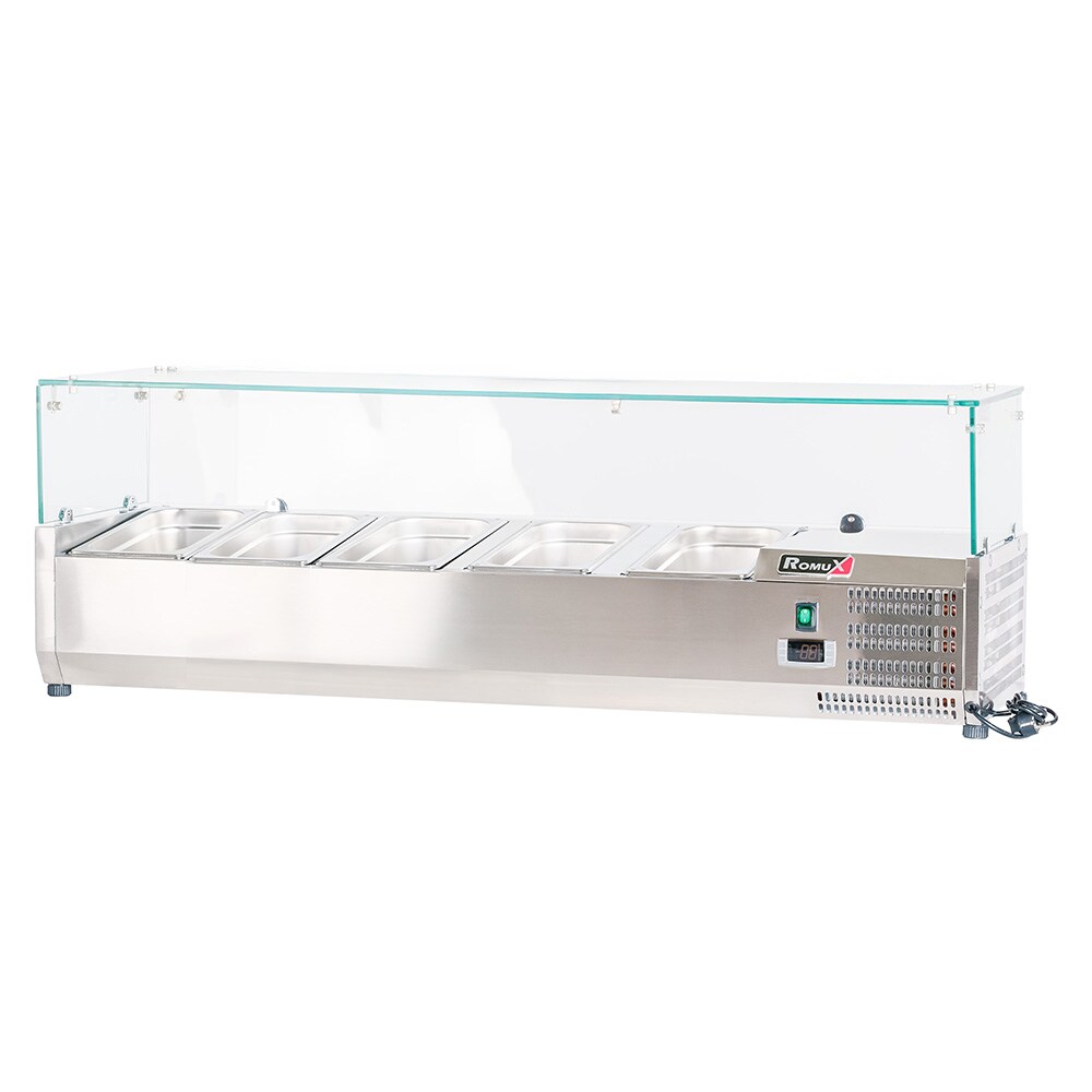 Romux® Kühlvitrinen für Tapas 140x39x44 cm aus Edelstahl und Glashaube mit 5 Becken GN 1/3 | Gekühlte Vitrine mit digitalem Dixell-Thermostat