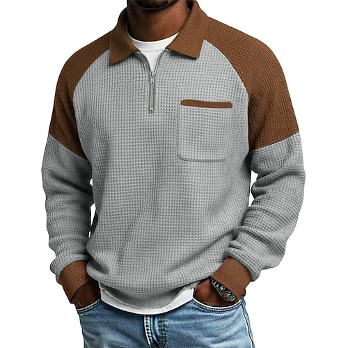 Per uomo Maglietta Waffle Polo con zip Manica Lunga Colletto Polo Maglione Zip a un quarto Autunno Autunno Inverno Tinta unica Blocco di colori Tradizionale / Vintage Casual Patchwork Blocco di