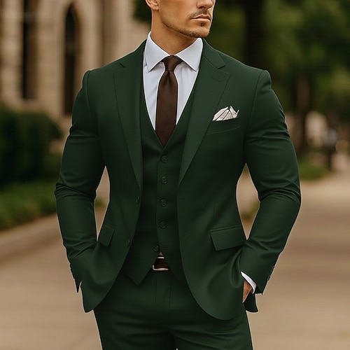 Uomo Matrimonio Completi Collare di chiusura Verde scuro Tinta unita Vestibilità aderente 2 pezzi Monopetto a un bottone