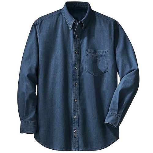 Camicia da uomo in jeans, blu scuro, a maniche lunghe, tinta unita, con risvolto, per vacanza, tutti i giorni, tasca frontale, abbigliamento, denim, moda, casual