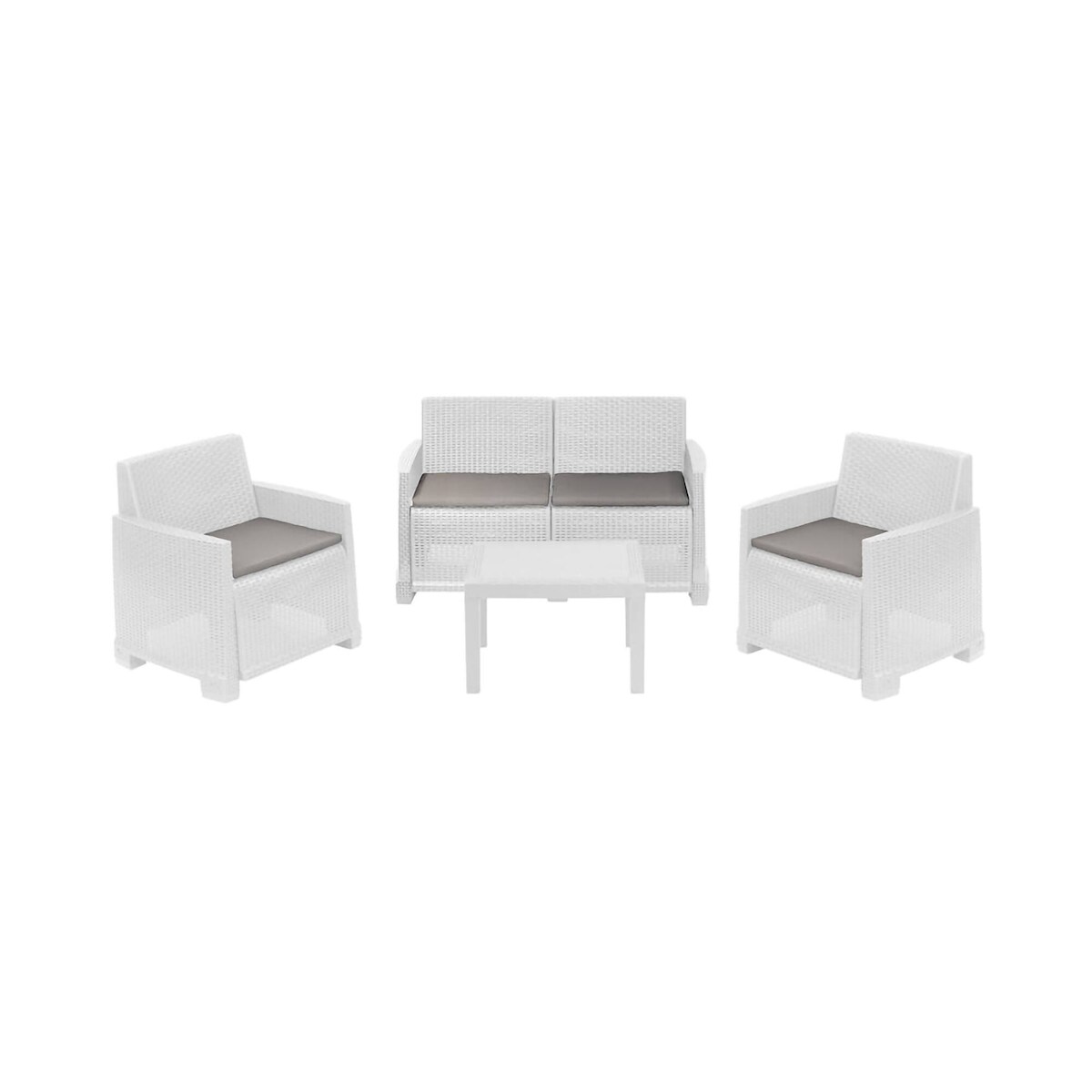 Dmora Outdoor-Lounge-Set Dbagnolin, Gartenkomposition mit 2 Sesseln, 1 Sofa und 1 Couchtisch, Rattan-Effekt mit Kissen, 100 % Made in Italy, Weiß