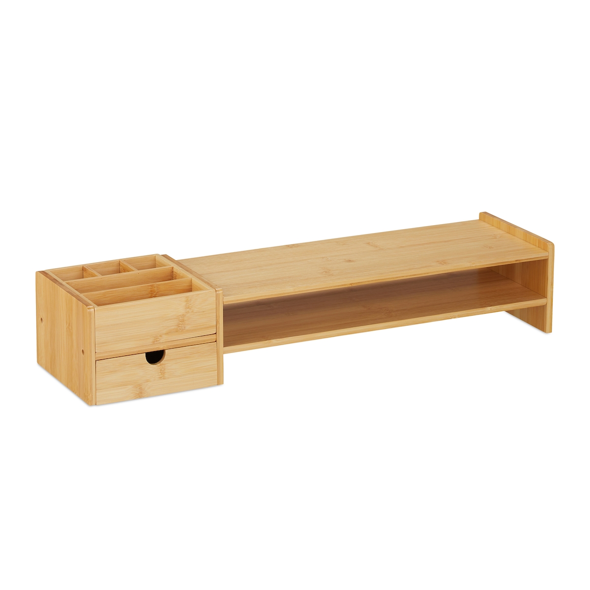 Relaxdays Monitorständer, Bambus, Schublade & 5 Fächer, HxBxT: 13 x 70 x 19 cm, Bildschirmständer Schreibtisch, natur