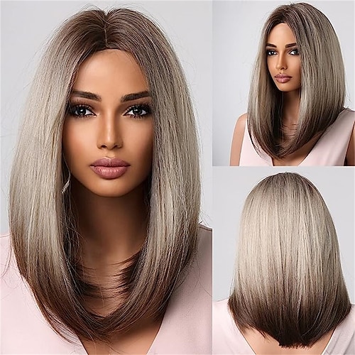 parrucche caschetto castano per donna biondo mette in risalto la parte centrale dei capelli sintetici corti e lisci