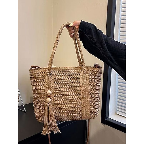 Borsa tote intrecciata bohémien da donna con nappe e perline di legno - dotata di tracolla regolabile, può essere indossata su una spalla o a tracolla, adatta per spiaggia, vacanze e uso all'aperto