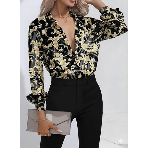 Per donna Camicia Floreale Grafico Geometrico Vintage Elegante Moderno Manica Lunga Colletto a Camicia Top Regolari Quotidiano Ferie Nero Vino Oro Autunno Inverno