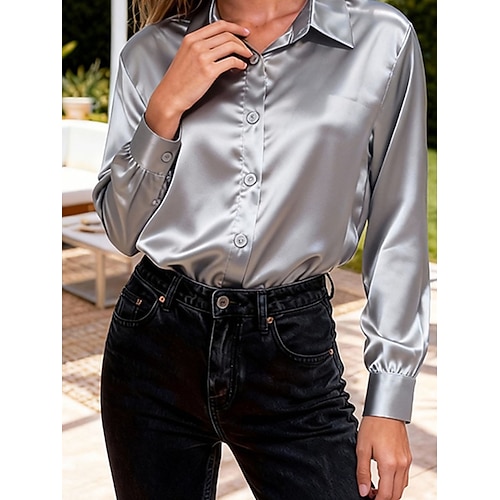 Per donna Camicia Elegant Elegante Top in raso Bottoni Tinta unica Vintage Tropicale Elegante Manica Lunga Scollo a V Colletto a Camicia Top Regolari Quotidiano Uscire Nero Cammello Marrone Grigio